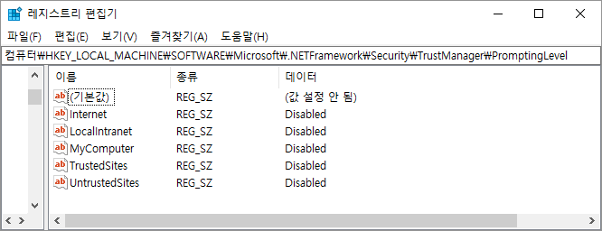 컴퓨터\HKEY_LOCAL_MACHINE\SOFTWARE\Microsoft\.NETFramework\Security\TrustManager\PromptingLevel