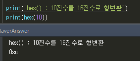 hex() : 10진수를 16진수로 형변환
