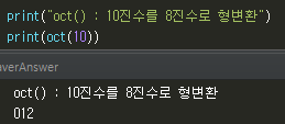 oct() : 10진수를 8진수로 형변환