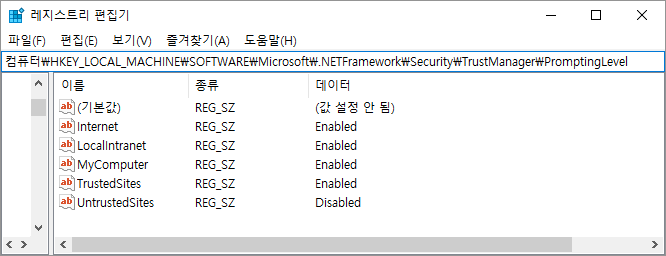 컴퓨터\HKEY_LOCAL_MACHINE\SOFTWARE\Microsoft\.NETFramework\Security\TrustManager\PromptingLevel